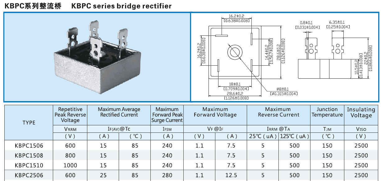 整流橋堆就是將整流管封在一個(gè)殼內(nèi)了。分全橋和半橋。全橋是將連接好的橋式整流電路的四個(gè)二極管封在一起。半橋是將兩個(gè)二極管橋式整流的一半封在一起,用兩個(gè)半橋可組成一個(gè)橋式整流電路,一個(gè)半橋也可以組成變壓器帶中心抽頭的全波整流電路,選擇整流橋要考慮整流電路和工作電壓。