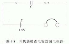 這種方法只適用于對電容量較大電容器的絕緣電阻的判斷,可以用一副耳機和一節(jié)1.5V干電池組成簡易測試電路,如圖4-8 所示。測試時,當(dāng)耳機與電容器斷續(xù)相碰時,電池向電容器充電,耳機會發(fā)出"喀喀"聲響。若多碰幾次,電容器被充滿電就昕不到"喀喀"聲了,說明電容器漏電流很小,絕緣電阻正常。若每相碰一次,耳機都發(fā)出很響的"喀喀"聲,說明電容器漏電大,絕緣電阻不正常。如果第一次相碰時就無聲響,并一直無聲響,說明電容器己斷路,不能使用。