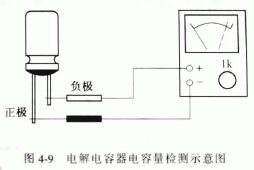 下面介紹一下用萬用表檢測電解電容器電容量的方法。首先將萬用表的歐姆擋置于R x 1k的位置,政表筆短接調(diào)零。將萬用表的黑表筆接電解電容器的正極,紅表筆接電解電容器的負極,如圖4-9 所示。由于原先電容器是未充電的,當(dāng)兩表筆剛接通電容器時,萬用表內(nèi)的電池通過表筆給電容器充電,由于電流流過電路,使萬用表的表針發(fā)生偏轉(zhuǎn)。電容正極量越大,表針的偏轉(zhuǎn)角度越大,如果電容量較小,檢測時表針的偏轉(zhuǎn)角度就較小??筛鶕?jù)這一原理和實際檢測的經(jīng)驗給出不同電容量所對應(yīng)的表針偏轉(zhuǎn)應(yīng)到達的位置,判斷所測電容器電容量的大小。表針偏轉(zhuǎn)位置與電容量的關(guān)系如表4-13 所示,供檢測時參考。