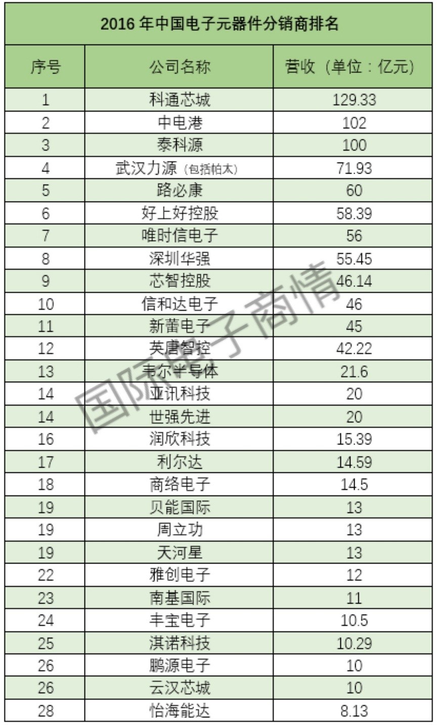 從榜單中可以看到,科通芯城、中電港、泰科源三家分銷商企業(yè)2016年業(yè)績均實(shí)現(xiàn)100億元的突破。