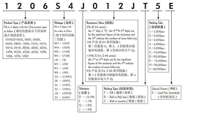 一.以厚聲貼片電阻1206S4J012JT5E為例: